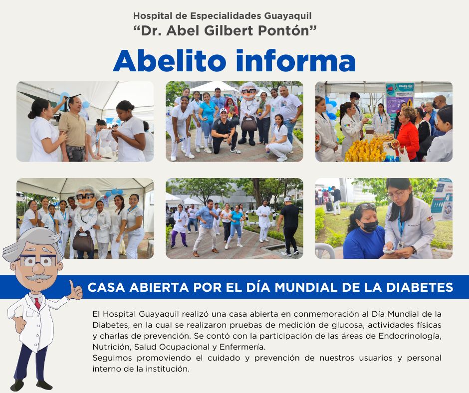 El Hospital Guayaquil realizó una casa abierta en conmemoración al Día Mundial de la Diabetes, en la cual se realizaron pruebas de medición de glucosa, actividades físicas y charlas de prevención. Se contó con la participación de las áreas de Endocrinología, Nutrición, Salud Ocupacional y Enfermería.