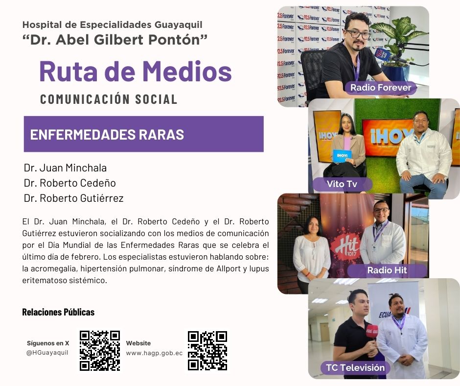 El Dr. Juan Minchala, el Dr. Roberto Cedeño y el Dr. Roberto Gutiérrez estuvieron socializando con los medios de comunicación por el Día Mundial de las Enfermedades Raras que se celebra el último día de febrero. Los especialistas estuvieron hablando sobre: la acromegalia, hipertensión pulmonar, síndrome de Allport y lupus eritematoso sistémico. 14:56:28 | 04 de Marzo, 2024